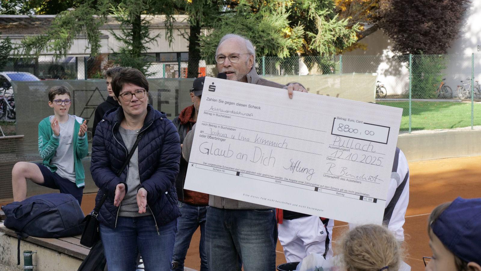 Beim Tennisturnier des TC Großhesselohe spielten rund 40 Kinder für den guten Zweck. Durch Teilnahmegebühren, Tombola, Versteigerungen, darunter handsignierte Preise von Joshua, sowie eine großzügige Zusatzspende von Schirmherr Ralf Büschl kam der beeindruckende Betrag zusammen.
